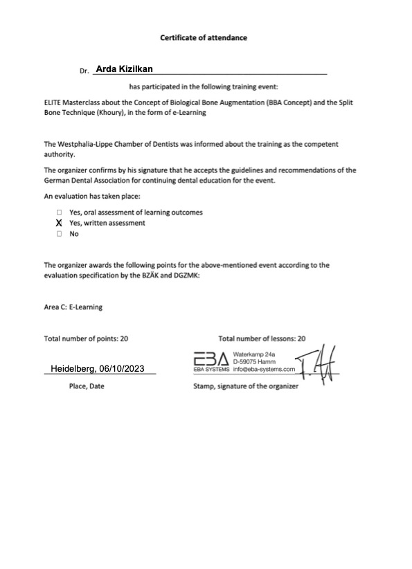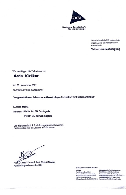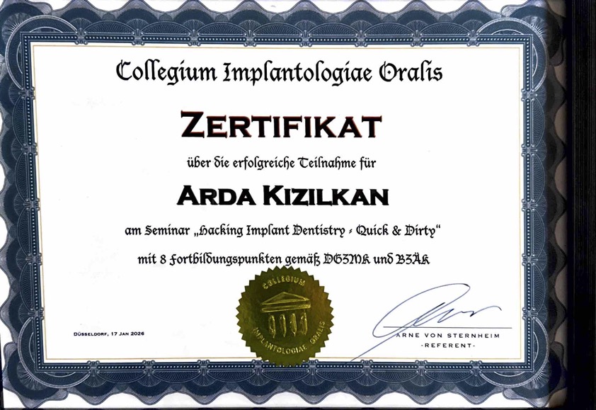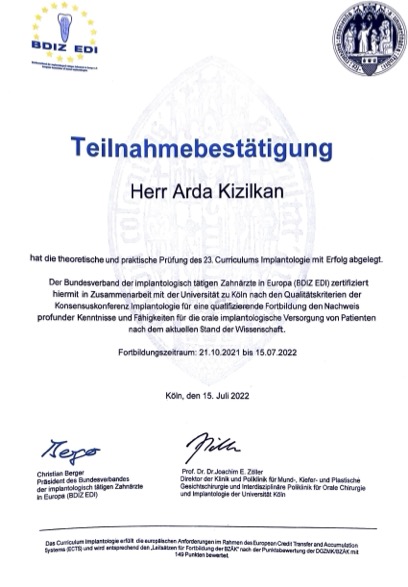 Ich habe das Curriculum Implantologie des Bundesverbandes der implantologisch tätigen Zahnärzte in Europa (BDIZ EDI) abgeschlossen. Die Weiterbildung wurde in Zusammenarbeit mit der Universität zu Köln durchgeführt und vermittelte eine umfassende theoretische und praktische Ausbildung in der implantologischen Versorgung.